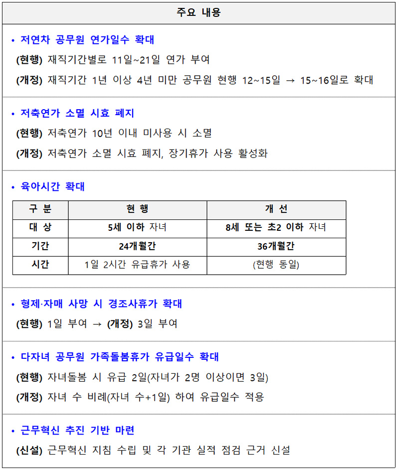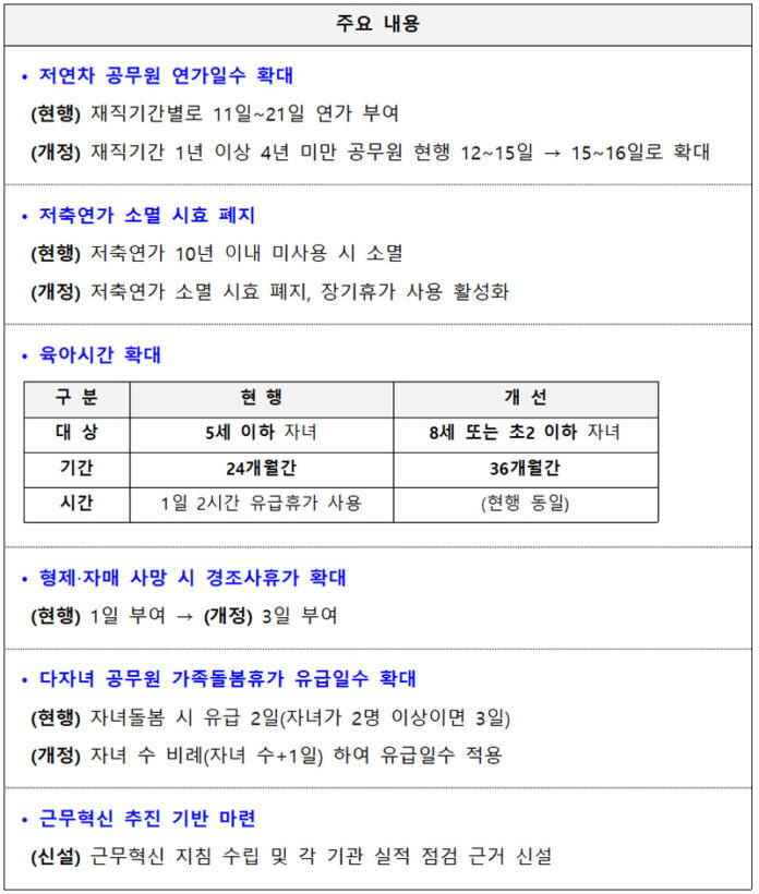 현행 10년인 저축연가 소멸시효가 폐지되는 한편, 형제·자매가 사망할 때 부여하는 경조사 휴가도 기존 1일에서 3일로 확대된다.