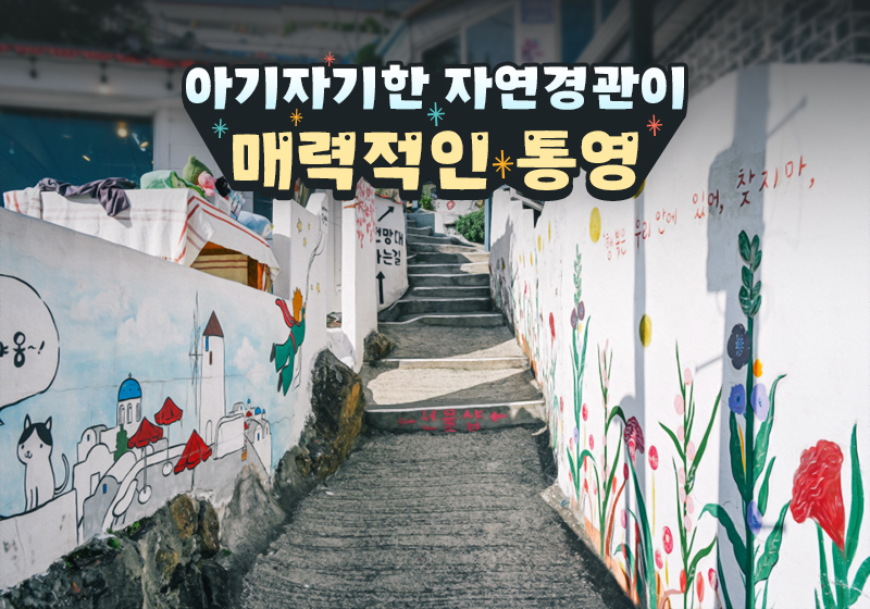 동피랑 벽화마을은 드라마 ‘착한남자’, ‘빠담빠담’ 등의 촬영 장소로도 알려지며 많은 사람들이 찾는 통영 관광 명소 중 한 곳입니다. 이곳은 골목과 계단을 따라 알록달록 그려진 벽화와 조형물이 있어 아기자기한 마을의 정취를 느낄 수 있는데요.